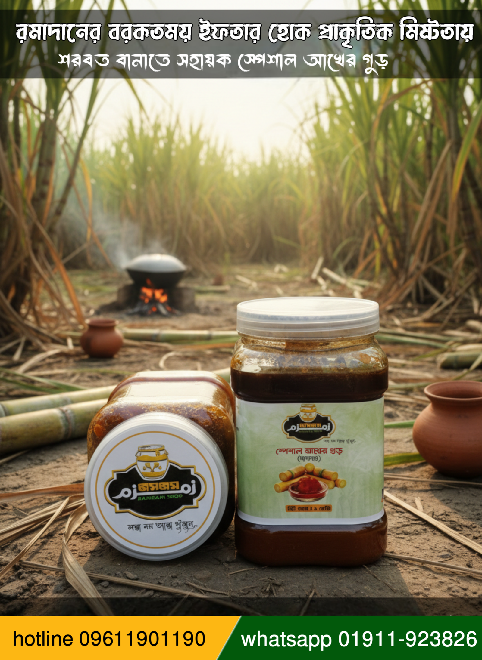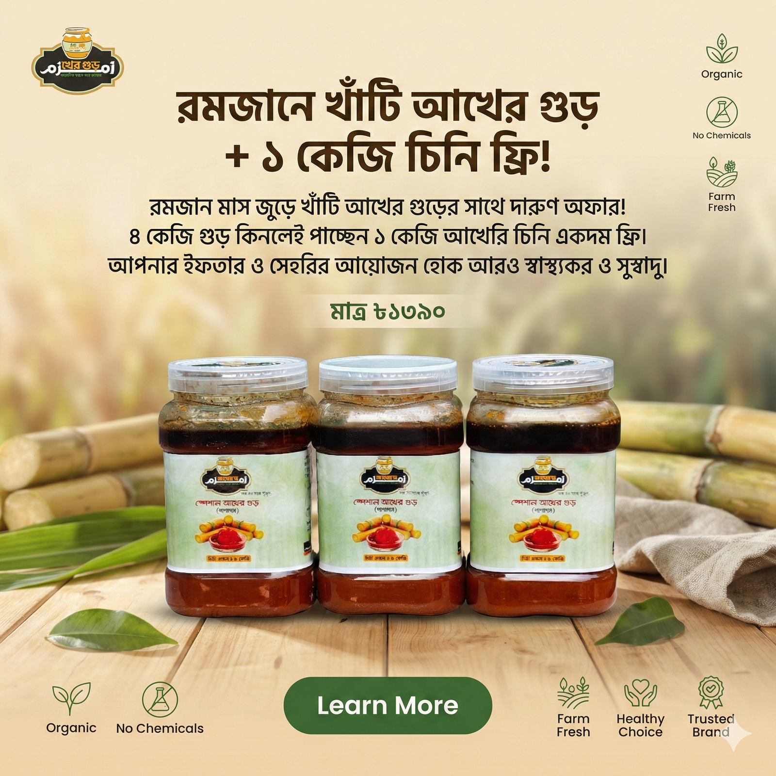 আমাদের আখের গুড় প্রাকৃতিক আখের রস থেকে ঐতিহ্যবাহী পদ্ধতিতে তৈরি। কোনো কেমিক্যাল, কৃত্রিম রং বা added preservatives নেই-একদম ন্যাচারাল।